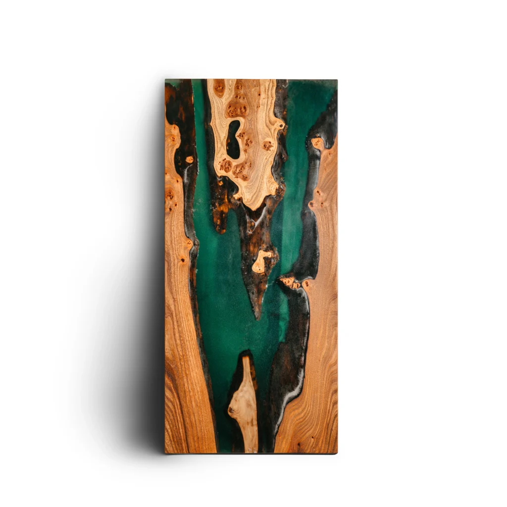 L’étape du choix de la résine époxy donne vie à votre création. Vous sélectionnez la couleur et le style qui reflètent votre univers : effet magma rouge intense, rivière bleu profond, lagon turquoise, noir profond ou blanc nacré. Chaque coulée est réalisée avec précision pour un rendu lisse, homogène, sans bulles, avec des finitions irréprochables. C’est ici que bois et résine fusionnent pour créer une pièce unique, audacieuse et durable.